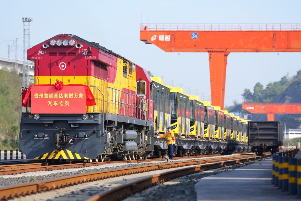 2024年10月28日,裝載著28輛“貴州造”新能源客車的出口專列??吭谫F陽國際陸港都拉營站,準備經由云南磨憨口岸出境前往老撾萬象。這是貴州的中老班列首次整列直發(fā),也是貴州本土生產的新能源客車首次出口老撾。