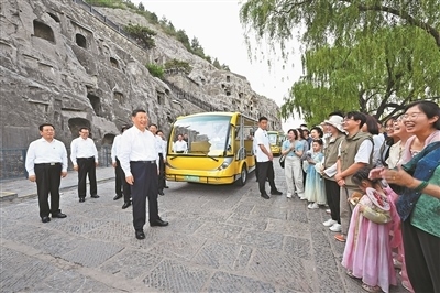已有1500多年歷史的龍門石窟,是重要的世界文化遺產(chǎn)。習(xí)近平來到這里,察看石窟整體布局風(fēng)貌和代表性窟龕、造像,同現(xiàn)場的文物保護(hù)工作者親切交流。他強(qiáng)調(diào),要把這些中華文化瑰寶保護(hù)好、傳承好、傳播好。游客們見到總書記,都十分欣喜,紛紛向總書記問好。習(xí)近平不時同大家交流,特別鼓勵小朋友們多到實地尋溯中華文化,從小樹立文化自信。他指出,文旅融合前景廣闊,要推動文旅產(chǎn)業(yè)高質(zhì)量發(fā)展,真正打造成為支柱產(chǎn)業(yè)、民生產(chǎn)業(yè)、幸福產(chǎn)業(yè)。