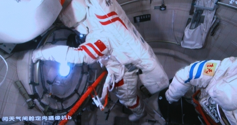這是6月26日在北京航天飛行控制中心屏幕上拍攝的神舟二十號航天員陳冬(右)與陳中瑞在問天氣閘艙準(zhǔn)備關(guān)閉艙門的畫面。新華社發(fā)(周柯毅 攝)