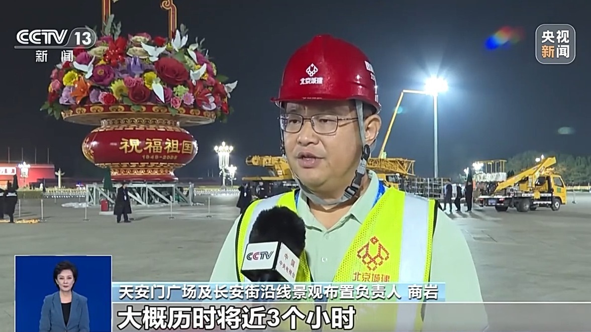天安門廣場(chǎng)及長(zhǎng)安街沿線景觀布置負(fù)責(zé)人 商巖:從吊裝準(zhǔn)備工作開始,一直到吊裝完成,大概歷時(shí)將近3個(gè)小時(shí)。保證籃盤和籃體的緊密結(jié)合,因?yàn)榛ɑ@在插置的過程中有一個(gè)觀賞角度,所以在吊裝和合龍整個(gè)過程當(dāng)中,四面相應(yīng)的觀賞面都要有工作人員要盯著,這個(gè)面不能有任何的變化。