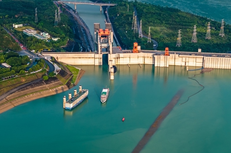 7月1日,在湖北宜昌,船舶有序通過(guò)三峽雙線五級(jí)船閘和升船機(jī)(無(wú)人機(jī)照片)。