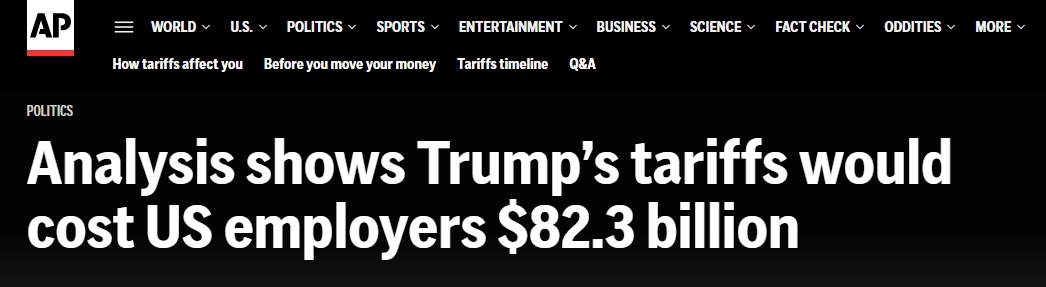 4月份,特朗普政府宣布所謂“對等關(guān)稅”政策后,金融市場出現(xiàn)恐慌。隨后,又設(shè)定了90天談判期,期間多數(shù)進(jìn)口商品面臨10%基準(zhǔn)稅率。報(bào)道稱,若4月2日的初始關(guān)稅維持不變,研究中所涉及的企業(yè)將承受更為高昂的1876億美元的額外成本。若按照現(xiàn)行稅率,823億美元成本平均到每位員工身上就是2080美元,相當(dāng)于年均薪資的3.1%。這一平均值涵蓋了無進(jìn)口業(yè)務(wù)與有進(jìn)口業(yè)務(wù)企業(yè)。