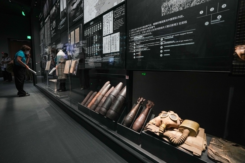7月8日,在中國(guó)人民抗日戰(zhàn)爭(zhēng)紀(jì)念館《為了民族解放與世界和平》主題展覽上,參觀(guān)者在展示日本侵略者實(shí)施細(xì)菌戰(zhàn)和化學(xué)戰(zhàn)暴行的區(qū)域參觀(guān)。