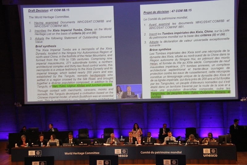 7月11日,在法國(guó)巴黎召開(kāi)的聯(lián)合國(guó)教科文組織第47屆世界遺產(chǎn)大會(huì)審議將“西夏陵”列入《世界遺產(chǎn)名錄》的決議草案。