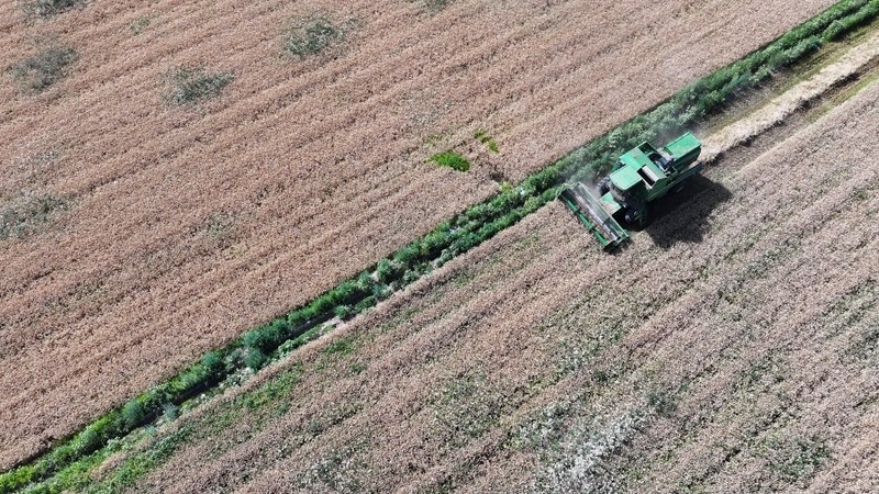 7月15日,收割機在銀川市賀蘭縣立崗鎮(zhèn)蘭星村收獲小麥(無人機照片)。