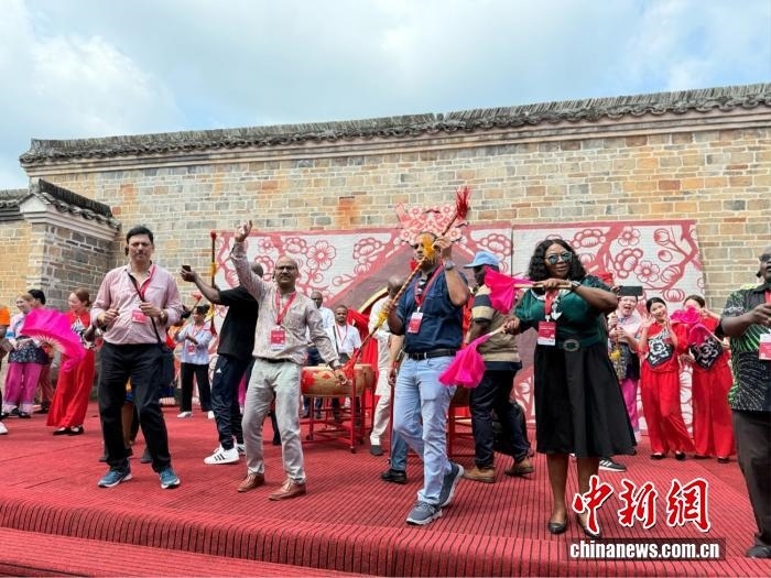 中新網(wǎng)7月21日電(記者 黃方) 鼓聲“咚咚咚”在江西贛州龍南市關(guān)西新圍響起,非洲記者大會(huì)秘書長威廉·奧洛首次嘗試舞龍。他興奮地?fù)u動(dòng)著龍頭,跟隨節(jié)奏躍動(dòng),忍不住連聲贊嘆:“這太有節(jié)奏感了!”