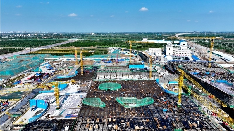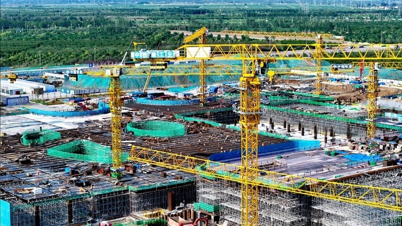 7月25日,在津?yàn)H高鐵山東東營(yíng)高鐵站現(xiàn)代綜合客運(yùn)樞紐及配套工程建設(shè)現(xiàn)場(chǎng),中鐵二十局工作人員在施工(無(wú)人機(jī)照片)。