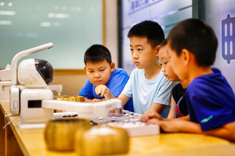 8月10日,小朋友在天津濱海文化中心與機器人下圍棋。