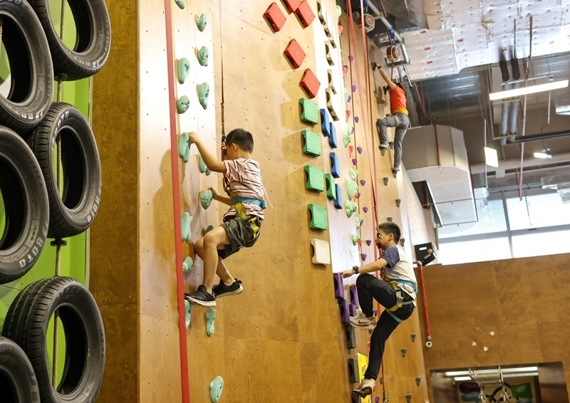 8月10日,小朋友在湖北省武漢市武昌區(qū)一家攀巖館體驗攀巖。