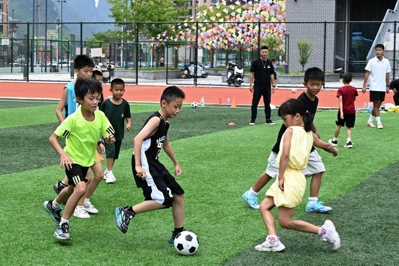 8月10日,在廣西河池市羅城仫佬族自治縣體育中心足球場,小朋友在踢足球。