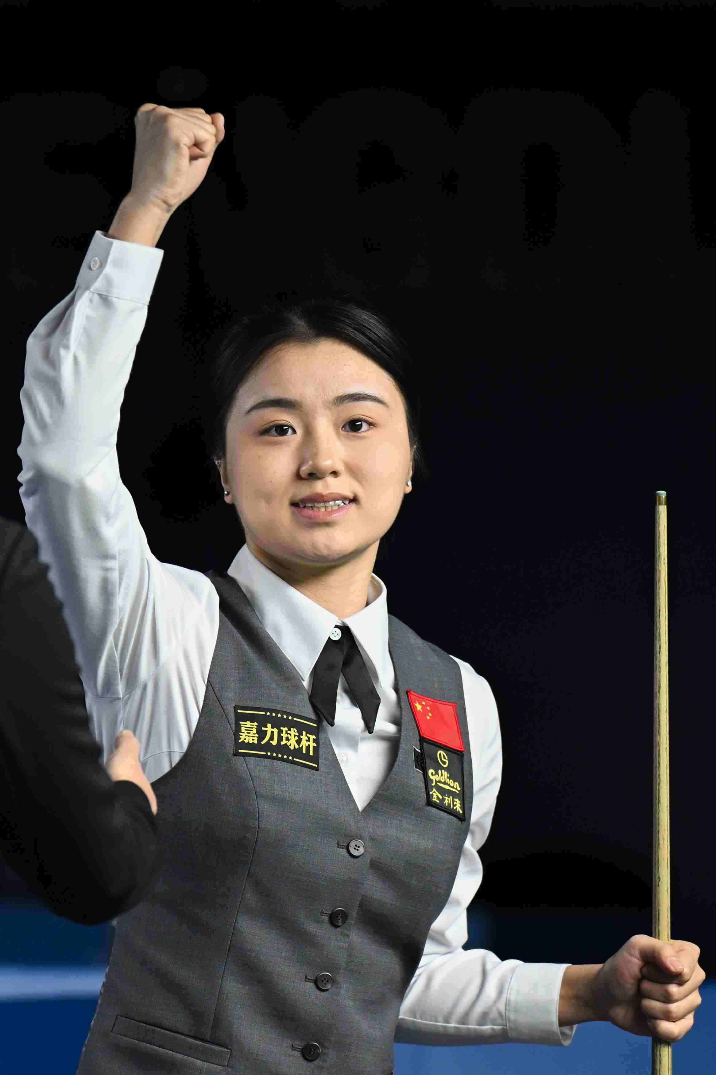 由于世運(yùn)會(huì)斯諾克項(xiàng)目采用三局兩勝制,選手們?cè)谶M(jìn)攻選擇上都格外謹(jǐn)慎。決賽首局雙方在攻防兩端幾度糾纏,最終對(duì)手防守出現(xiàn)漏洞,白雨露上手42:18拿下首局。第二局的劇情更為跌宕起伏,白雨露取得10:1領(lǐng)先后貢獻(xiàn)精彩防守,那魯差數(shù)度解球未果,被罰20分。不過(guò)白雨露隨后上手后白球掉袋,那魯差一度將分差縮小至10分。此時(shí)臺(tái)面只剩兩顆球,分?jǐn)?shù)仍夠?qū)κ址闯?。關(guān)鍵時(shí)刻,白雨露果斷選擇進(jìn)攻遠(yuǎn)臺(tái)粉球,隨著粉球應(yīng)聲落袋,體育館內(nèi)爆發(fā)出熱烈的歡呼。雙方握手之后,白雨露轉(zhuǎn)向觀眾,舉起握拳的右手。
