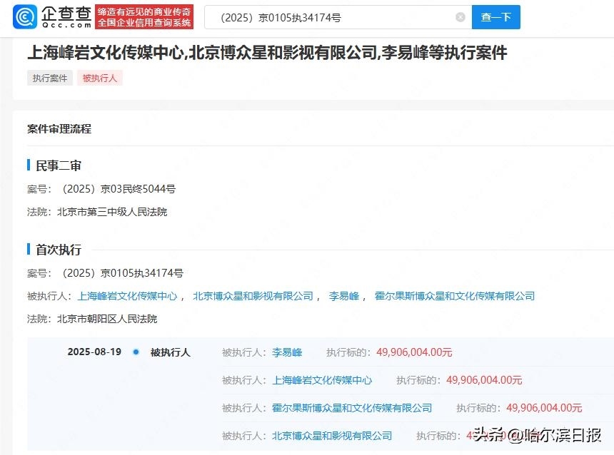 8月21日,記者從企查查獲悉,近日,李易峰、上海峰巖文化傳媒中心、北京博眾星和影視有限公司等被北京市朝陽區(qū)人民法院強制執(zhí)行約4990萬元。其中,上海峰巖文化傳媒中心成立于2018年,由李易峰個人出資。