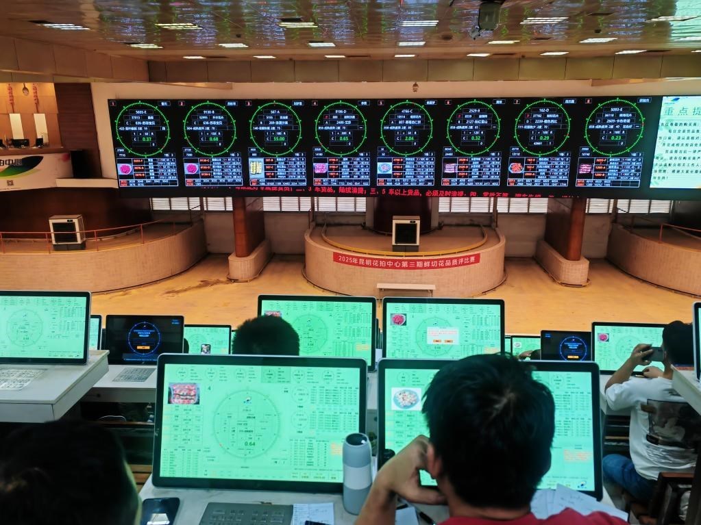 記者在昆明國(guó)際花卉拍賣交易中心看到,拍賣大鐘界面顯示著各種花卉的信息,數(shù)百名購(gòu)買(mǎi)商操作著競(jìng)價(jià)器選購(gòu)鮮花。昆明國(guó)際花卉拍賣交易中心副總經(jīng)理汪洋介紹,這里每天的鮮花交易量都超700萬(wàn)枝,單日最高交易量超1100萬(wàn)枝,30%以上的鮮花被各大電商和直播團(tuán)隊(duì)拍下,他們?cè)倌玫诫娚唐脚_(tái)或直播間銷售。