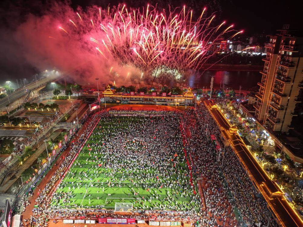 7月26日,貴州“村超”球場拍攝的煙花秀(無人機(jī)照片)。當(dāng)日,貴州榕江舉行主題為“感恩重啟·貴州超力量”的超級星期六活動,球星巴喬、卡洛斯現(xiàn)場助陣,助力“村超”重燃賽事,正式回歸。新華社記者 楊文斌 攝