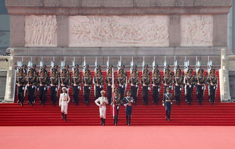 9月3日,紀(jì)念中國(guó)人民抗日戰(zhàn)爭(zhēng)暨世界反法西斯戰(zhàn)爭(zhēng)勝利80周年大會(huì)在北京隆重舉行。這是國(guó)旗護(hù)衛(wèi)隊(duì)官兵護(hù)衛(wèi)著五星紅旗,從人民英雄紀(jì)念碑行進(jìn)至廣場(chǎng)北側(cè)升旗區(qū)。
