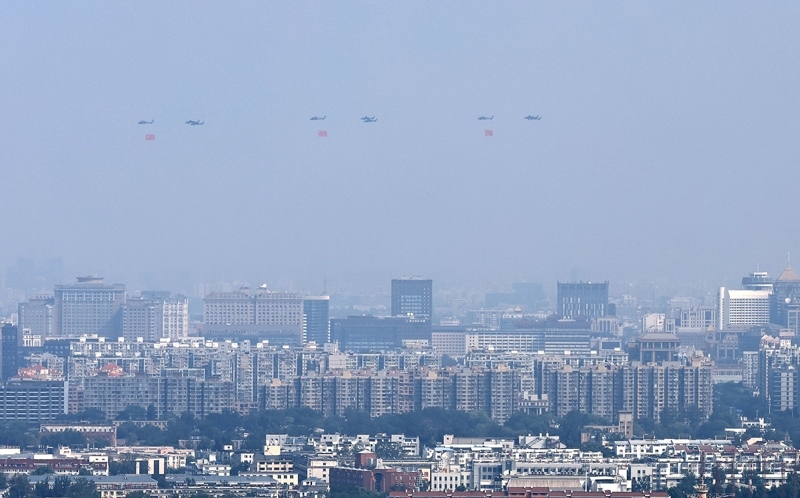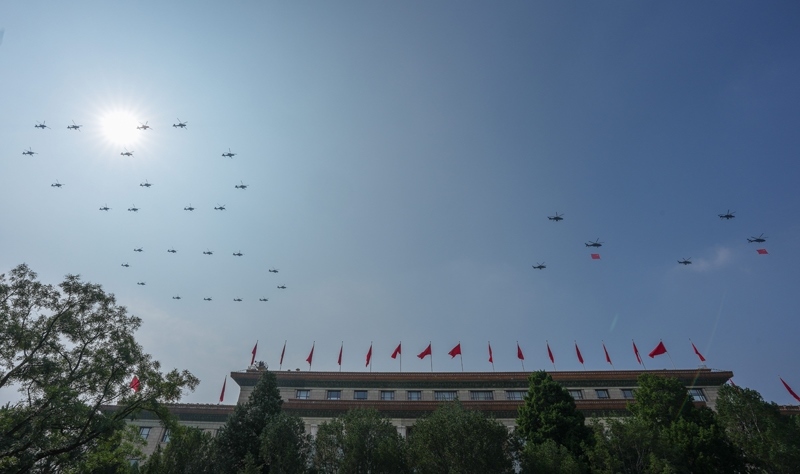 9月3日,紀念中國人民抗日戰(zhàn)爭暨世界反法西斯戰(zhàn)爭勝利80周年大會在北京隆重舉行。這是空中護旗梯隊飛過天安門廣場上空,26架直升機匯成巨大的“80”字樣。