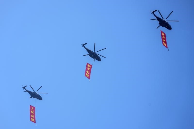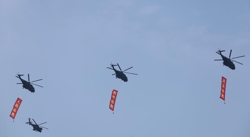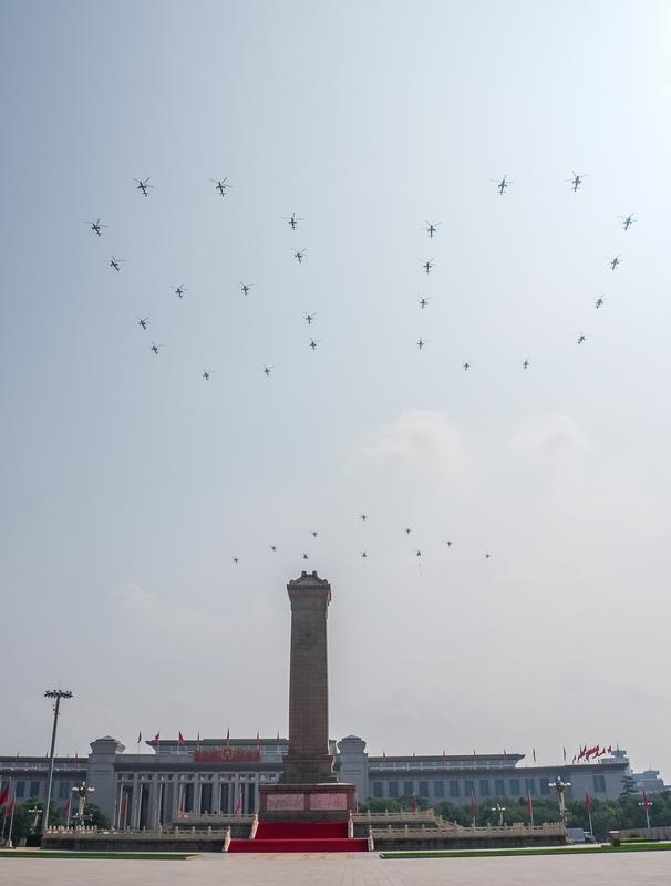 9月3日,紀念中國人民抗日戰(zhàn)爭暨世界反法西斯戰(zhàn)爭勝利80周年大會在北京隆重舉行。這是空中護旗梯隊飛過天安門廣場上空,26架直升機匯成巨大的“80”字樣。
