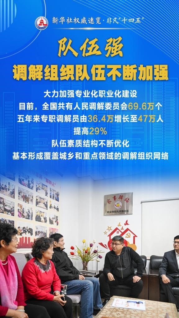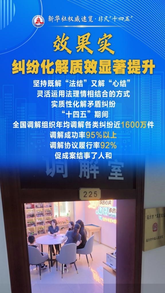 “十四五”期間,司法部堅持和發(fā)展新時代“楓橋經(jīng)驗”,充分發(fā)揮調(diào)解職能作用,以“機制全、領域廣、隊伍強、效果實”十二字為工作“秘訣”,大力加強矛盾糾紛排查化解,切實保障群眾合法權(quán)益,維護社會和諧穩(wěn)定。