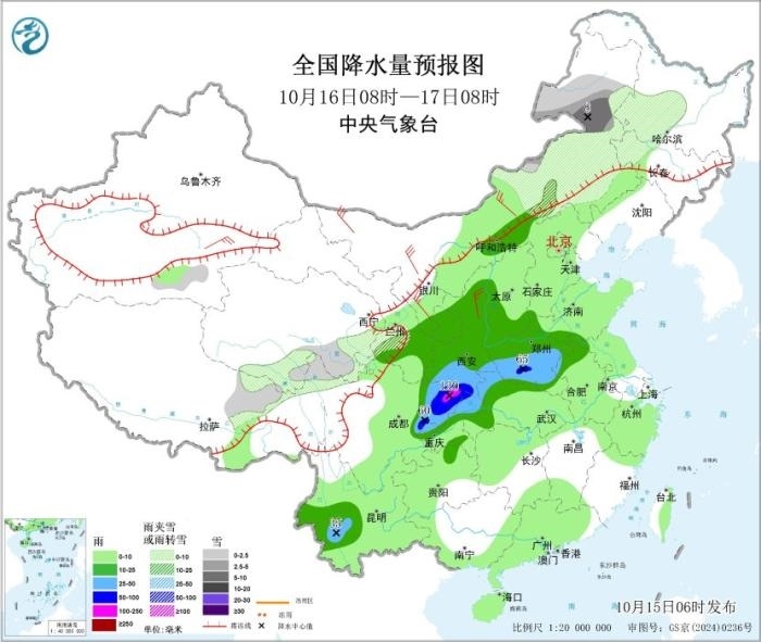 10月16日08時至17日08時,內(nèi)蒙古東部、黑龍江西部、吉林西部、甘肅西南部、青海東部和南部、西藏東北部等地部分地區(qū)有小到中雪或雨夾雪,內(nèi)蒙古東北部等地部分地區(qū)有大雪;四川盆地東部、西北地區(qū)東部、黃淮西部、江漢西部和北部、云南西南部等地部分地區(qū)有中到大雨,其中,陜西南部、四川東北部、重慶西北部、河南西南部等地部分地區(qū)有暴雨或大暴雨(100~120毫米)。新疆南疆盆地、內(nèi)蒙古中西部、西北地區(qū)東部等地部分地區(qū)有4~6級風。