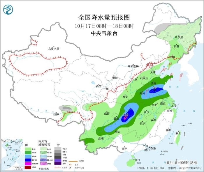 10月17日08時至18日08時,東北地區(qū)中北部、內(nèi)蒙古東北部、西藏東北部等地的部分地區(qū)有小到中雪或雨夾雪;華北南部、黃淮、江淮北部、湖北、重慶、貴州中北部、湖南西北部、云南東北部和西南部等地部分地區(qū)有中到大雨,其中,山東南部、河南東部、安徽北部、江蘇北部、湖北西南部、湖南西北部、重慶東部、貴州東北部等地部分地區(qū)有暴雨或大暴雨(100~110毫米)。內(nèi)蒙古中東部、華北北部和東部、黃淮、江淮等地部分地區(qū)有4~6級風。