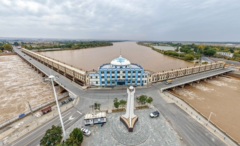 這是10月16日在內(nèi)蒙古巴彥淖爾市磴口縣拍攝的開閘放水的三盛公水利樞紐(無人機照片)。