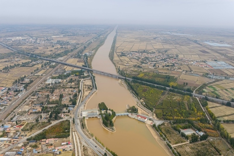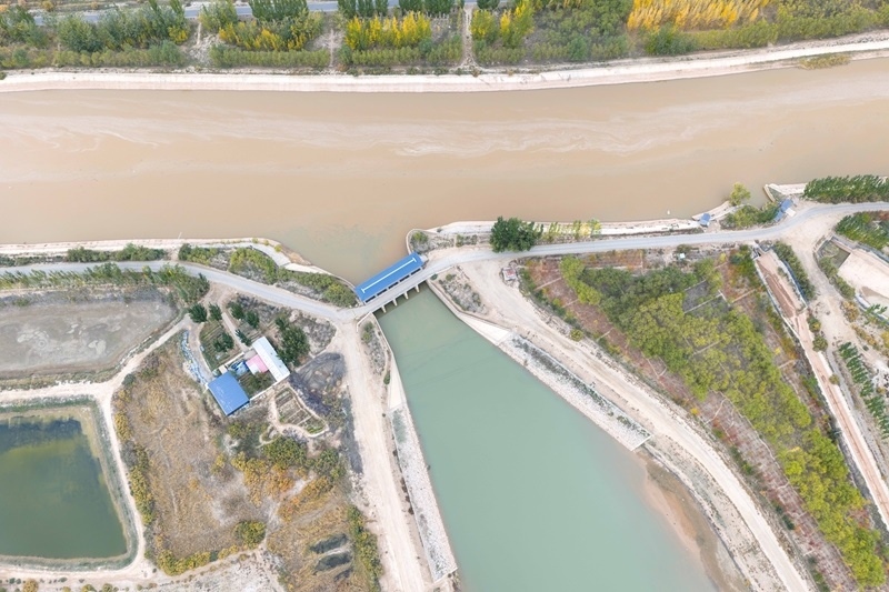 10月16日,用于灌溉的黃河水流經(jīng)內(nèi)蒙古巴彥淖爾市臨河區(qū)境內(nèi)的總干渠第二分水樞紐(無人機照片)。