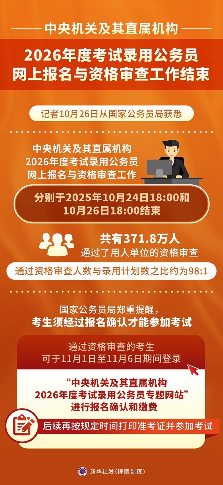 國家公務(wù)員局鄭重提醒,考生須經(jīng)過報名確認(rèn)才能參加考試。通過資格審查的考生可于11月1日至11月6日期間,登錄“中央機(jī)關(guān)及其直屬機(jī)構(gòu)2026年度考試錄用公務(wù)員專題網(wǎng)站”進(jìn)行報名確認(rèn)和繳費,后續(xù)再按規(guī)定時間打印準(zhǔn)考證并參加考試。