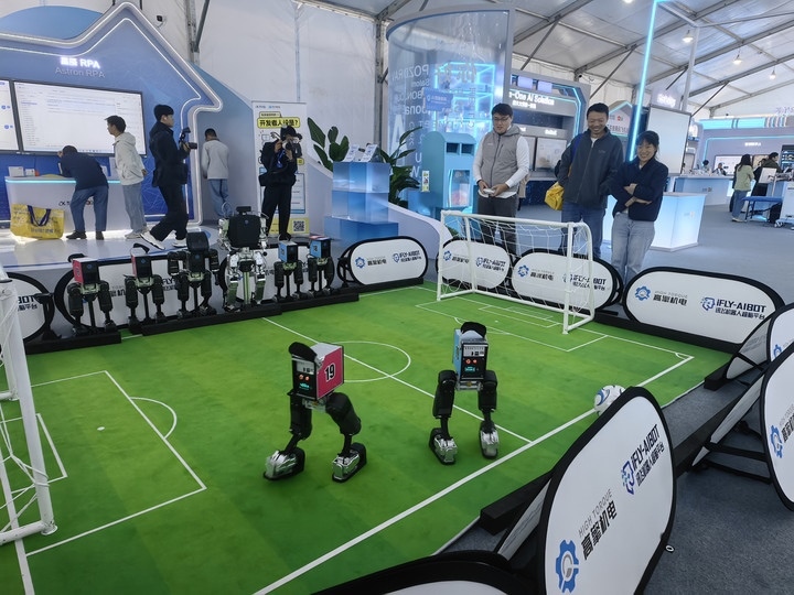 機(jī)器人在第八屆世界聲博會上進(jìn)行足球比賽(11月3日攝)。新華社記者 汪海月 攝