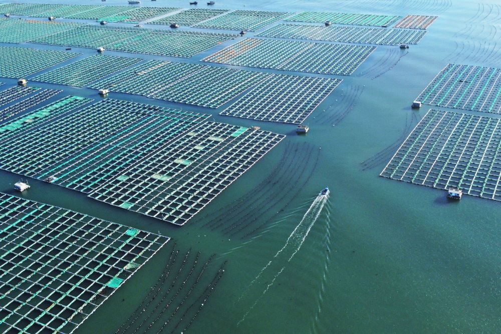 ↑ 11月10日,在山東省榮成市桑溝灣海洋牧場,養(yǎng)殖工人在養(yǎng)殖區(qū)穿梭作業(yè)(無人機(jī)照片)。新華社發(fā)(王福東 攝)