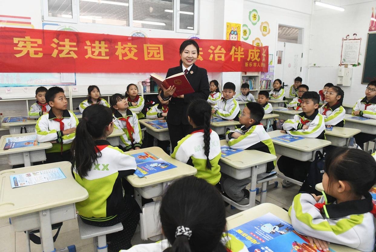 12月4日,在河北省石家莊市欒城區(qū)凌空橋路小學(xué),欒城區(qū)法院的工作人員為學(xué)生們普及憲法知識。(工人日報(bào)通訊員 李明發(fā) 攝)