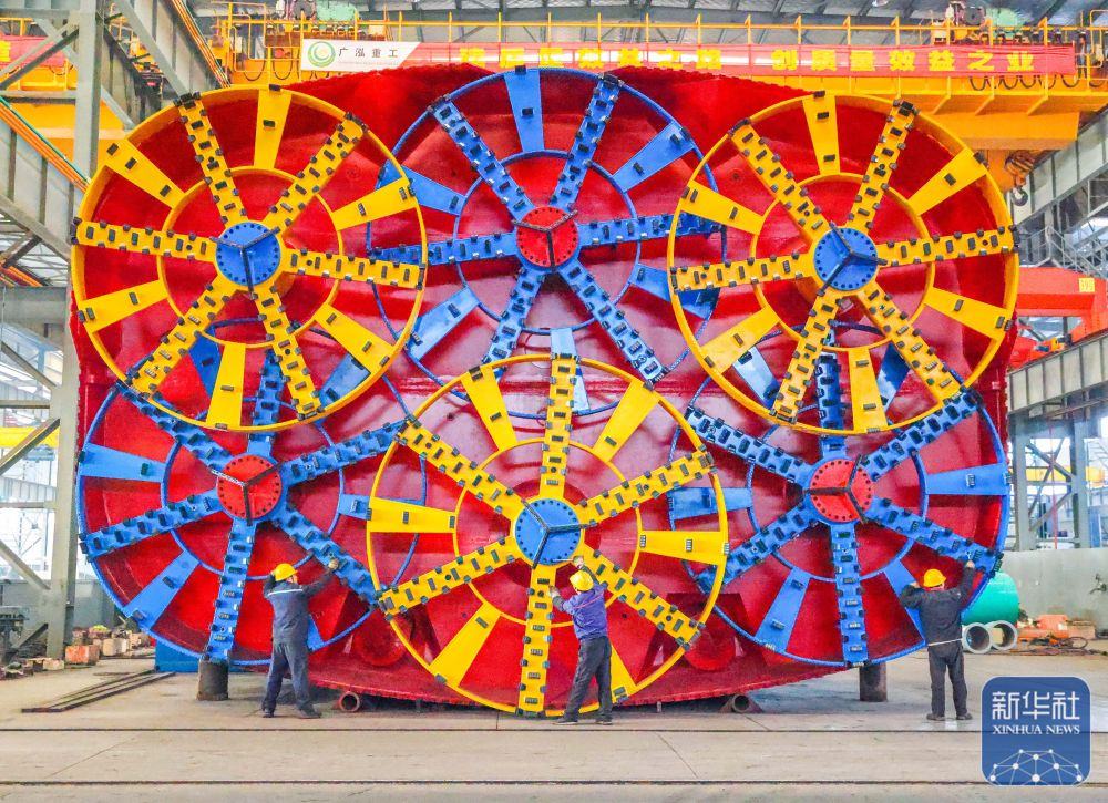 ↑ 12月15日,中鐵科工集團武漢江夏制造基地技術(shù)工人對盾構(gòu)機配件進行裝配作業(yè)。新華社發(fā)(趙軍攝)