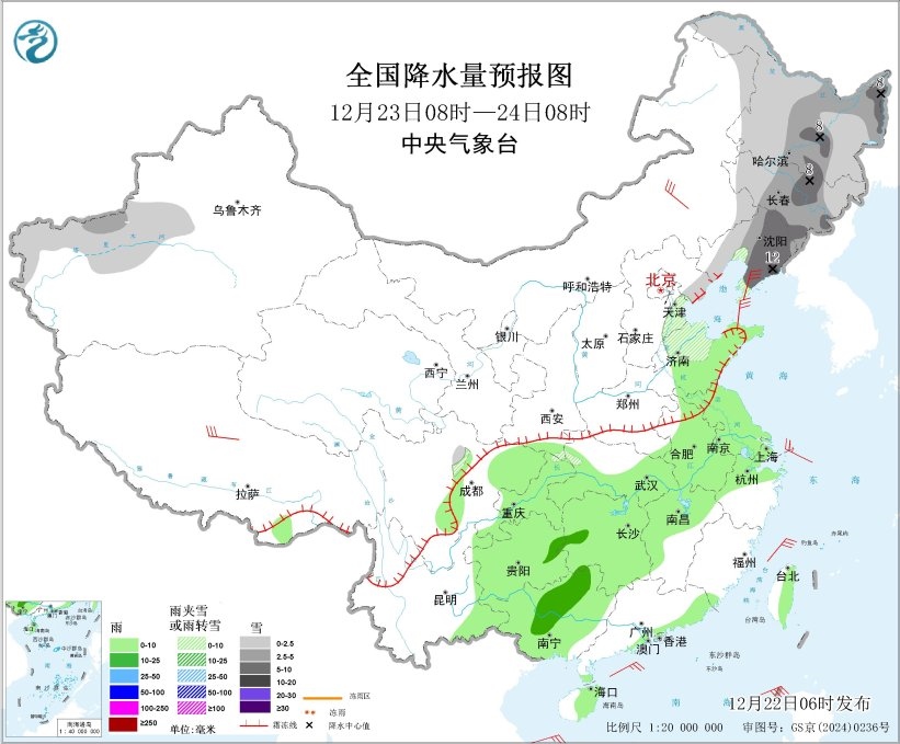 12月23日08時(shí)至24日08時(shí),東北地區(qū)、新疆南疆西部山區(qū)、華北東部、山東北部等地部分地區(qū)有小到中雪或雨夾雪,其中,黑龍江中東部、吉林中部、遼寧東部局地大到暴雪(10~12毫米)。黃淮東部、江淮、江漢大部、江南北部和西部、西南地區(qū)東部、廣西、廣東東南部沿海、海南島東部、臺灣島東部等地部分地區(qū)有小雨,其中,湖南西部、貴州東北部、廣西中部等地部分地區(qū)有中雨。內(nèi)蒙古中東部、遼東半島、西藏中北部等地部分地區(qū)有4~6級風(fēng);渤海、渤海海峽、黃海大部海域、東海西部海域、臺灣海峽、巴士海峽、南海北部海域?qū)⒂?~7級大風(fēng)、陣風(fēng)8~9級。