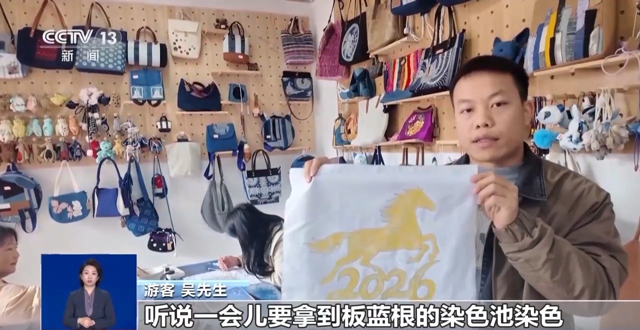 游客 吳先生:我畫的是一幅奔馬,聽說一會(huì)兒要拿到板藍(lán)根的染色池染色,脫蠟以后做成方巾。明年是2026年,祝大家馬到成功。