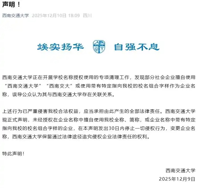 2025年12月10日,西南交通大學(xué)發(fā)表聲明稱,該校正在開展學(xué)校名稱授權(quán)使用的專項清理工作,發(fā)現(xiàn)部分社會企業(yè)擅自使用“西南交通大學(xué)”“西南交大”或使用帶有特定指向該校的校名組合字樣作為企業(yè)名稱,誤導(dǎo)公眾認(rèn)為其與西南交通大學(xué)存在關(guān)聯(lián)關(guān)系。