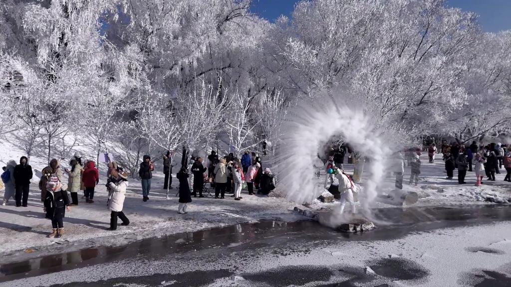 寒冬時(shí)節(jié),吉林省吉林市松花江畔?,F(xiàn)“忽如一夜春風(fēng)來,千樹萬樹梨花開”的霧凇奇景。