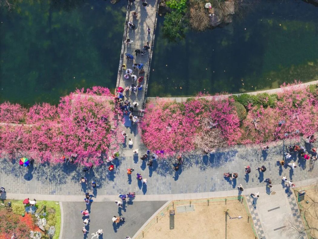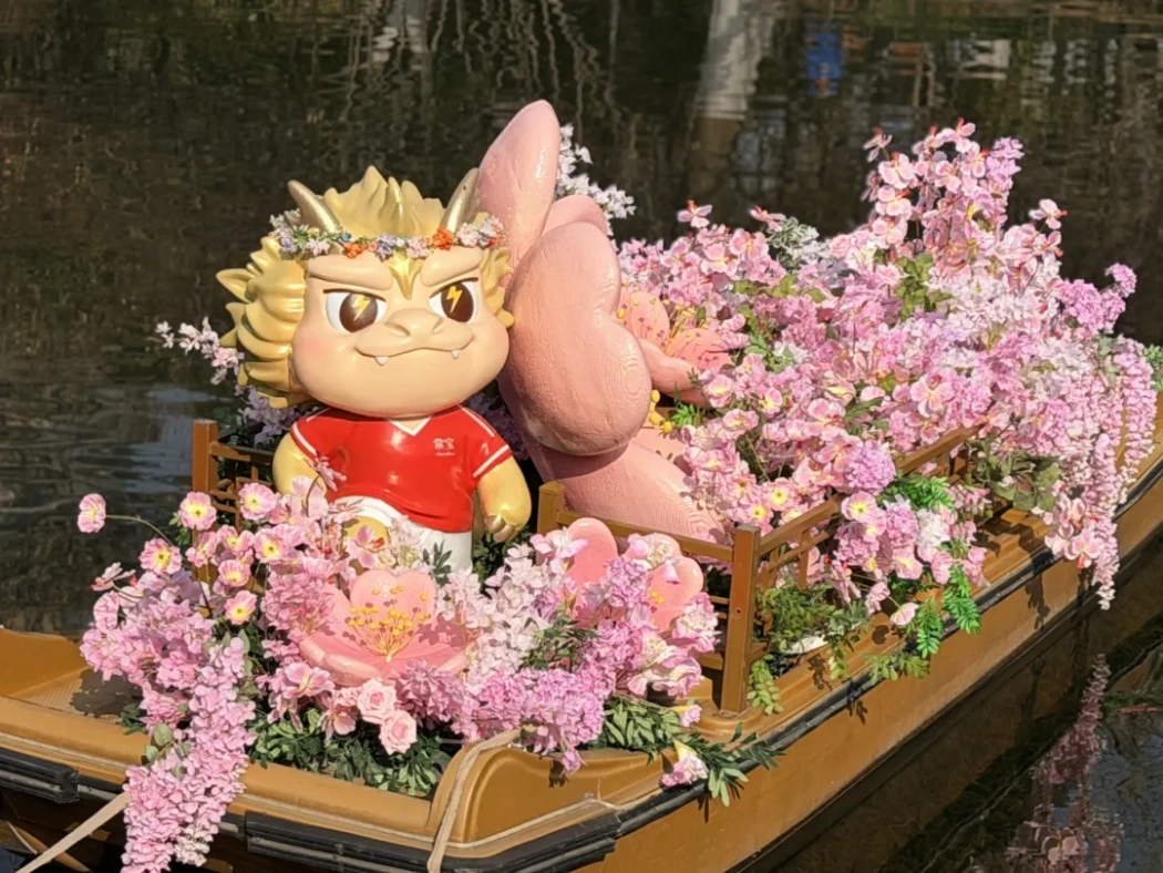在江南水鄉(xiāng),早春的序曲總是由梅花奏響。江蘇常州便是這抹春色里最具代表性的剪影。龍城正月,古運河畔紅燈籠高掛,紅梅公園內(nèi),唐代紅梅閣翹角飛檐,閣前紅梅燦若云霞,恰如趙翼詩中所繪的盛景。這里的賞梅,早已不是單純的游園,而是一場雅俗共賞的年俗盛會。文旅IP“常寶"穿梭送福,打卡點紅燈籠高懸,大年初一的市集上,手作、梅花好物琳瑯滿目,糖畫、梅花酥香氣四溢,文筆塔的花瀑氛圍拉滿,市民在梅香與煙火氣中收獲新春幸福。