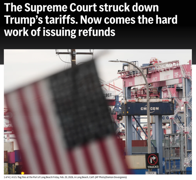 △美聯(lián)社報(bào)道,最高法院駁回特朗普的關(guān)稅政策后,艱巨的退還稅款任務(wù)開始了