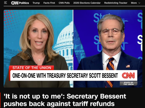 貝森特當(dāng)天在CNN接受采訪時(shí)強(qiáng)調(diào)兩點(diǎn):第一,最高法院對總統(tǒng)依據(jù)IEEPA征收關(guān)稅的權(quán)力做了“非常狹義”的解讀,但并沒有涉及退款問題;第二,案件已發(fā)回下級法院,因此退款“不是政府決定,而是由下級法院決定”。 如果只看字面,這兩句話都有一定真實(shí)性,但若看整體效果,卻更像是一場有技巧的責(zé)任轉(zhuǎn)移。