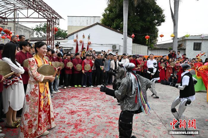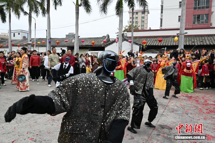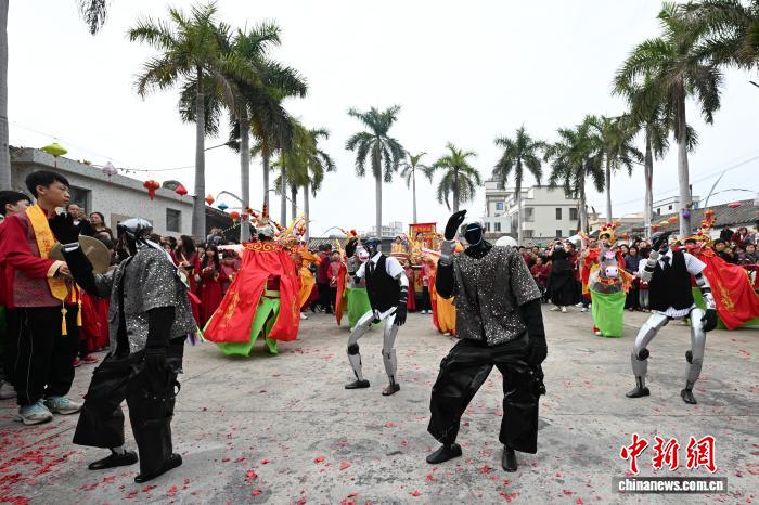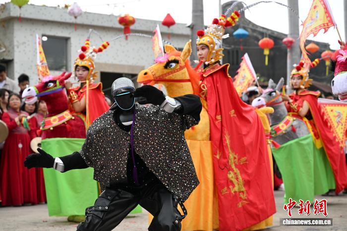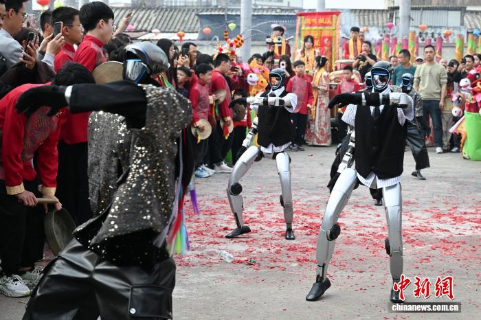 2月24日,廣東省潮州市田頭何村開展民俗巡游活動(dòng),機(jī)器人與布馬舞舞者共舞,吸引村民觀看。中新社記者 陳楚紅 攝
