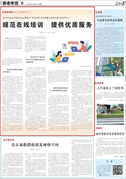 根據(jù)網(wǎng)友反饋的問題,6月26日,人民日報讀者來信版“來信調(diào)查”欄目刊發(fā)在線培訓(xùn)調(diào)查報道《規(guī)范在線培訓(xùn) 提供優(yōu)質(zhì)服務(wù)》,文中多處引用了人民網(wǎng)“人民投訴”平臺用戶相關(guān)案例和線索。
