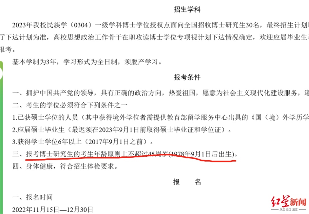 而根據(jù)《青海民族大學(xué)2023年民族學(xué)博士研究生招生簡章》,報(bào)考博士研究生的考生年齡原則上不超過45周歲(1978年9月1日后出生)。資料顯示,阿進(jìn)錄為1973年出生。對(duì)于網(wǎng)友提到的“年齡不符合報(bào)考條件”,上述工作人員表示:“他資格審查是通過的?!?/strong>