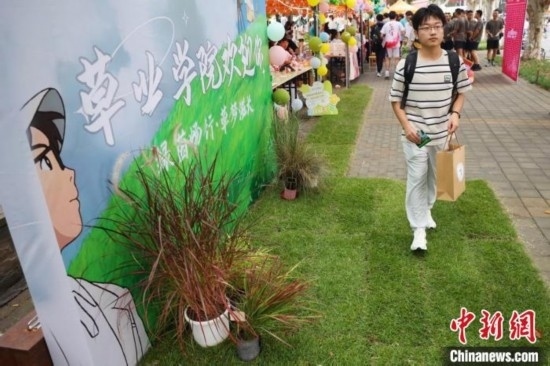 新生從展示的草皮上走過,該草種為南京農(nóng)業(yè)大學(xué)草坪科學(xué)與管理團隊自主培育的藍光中華結(jié)縷草,葉寬中等,葉色藍綠,觀賞度高,且耐踐踏,抗旱性強,抗病蟲能力強。泱波 攝