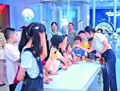 暑期,安徽省科技館在常設(shè)展覽之外開展研學(xué)營、科學(xué)課程、科學(xué)實驗等科普活動,讓孩子們在豐富多彩的活動中感受科技魅力。圖為7月10日,工作人員與參加研學(xué)營的小朋友互動。(新華社記者 傅天攝)