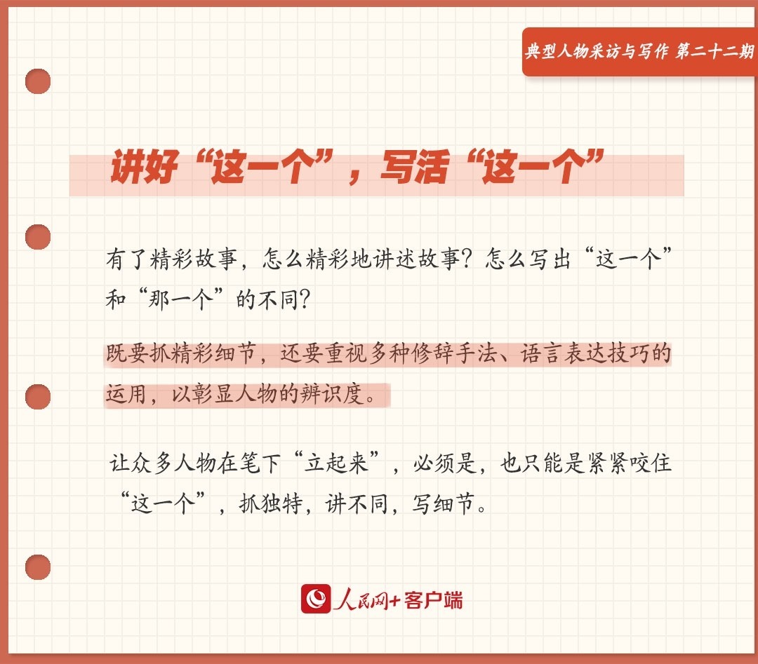 把好故事講精彩,讓“這一個”立起來,既要抓精彩細(xì)節(jié),還要重視多種修辭手法、語言表達(dá)技巧的運(yùn)用,以彰顯人物的辨識度。
