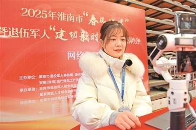 近日,安徽省淮南市舉行2025年“春風(fēng)送暖”大型招聘會(huì),351家企業(yè)提供近萬個(gè)工作崗位。圖為一名主播在招聘會(huì)現(xiàn)場(chǎng)進(jìn)行網(wǎng)絡(luò)直播助力就業(yè)。