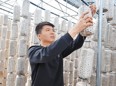 李強在木耳大棚里檢查菌包。