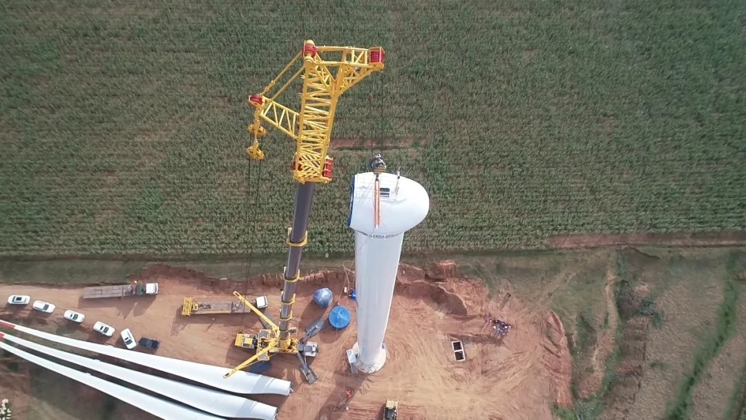 9月8日,第一臺風機整體吊裝成功