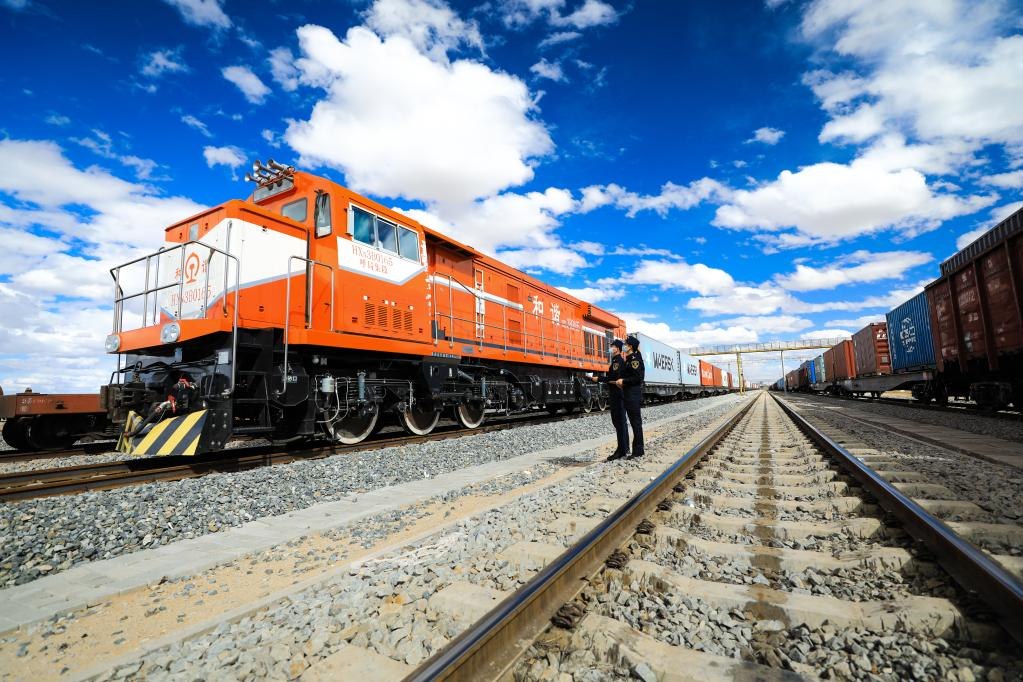 在二連浩特鐵路口岸,二連海關(guān)關(guān)員現(xiàn)場核對出境中歐班列車輛及集裝箱信息。(受訪者供圖)