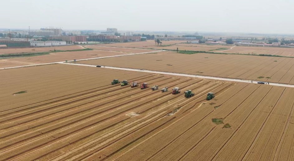 夏收時節(jié),在山東省德州市臨邑縣德平鎮(zhèn)大西關(guān)村的麥田里,幾臺收割機排成一排,轟隆隆地穿梭在金色的麥浪中。富民家庭農(nóng)場負責(zé)人魏德東指著剛收獲的小麥說:“畝產(chǎn)量將近1300斤,一畝地比往年增產(chǎn)了百十斤,不僅產(chǎn)量高,品質(zhì)也好?!?/p>