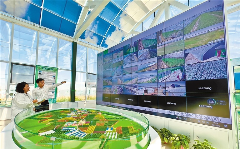 近日,巴彥淖爾市杭錦后旗二道橋鎮(zhèn)鄉(xiāng)村振興設(shè)施農(nóng)業(yè)產(chǎn)業(yè)園區(qū)工作人員正在記錄現(xiàn)代農(nóng)業(yè)數(shù)字平臺監(jiān)測數(shù)據(jù)。據(jù)悉,該園區(qū)占地2000畝,投資4600萬元,是集智慧農(nóng)業(yè)管理、引黃滴灌示范、集中連片種植等多項功能為一體的現(xiàn)代農(nóng)業(yè)產(chǎn)業(yè)園區(qū)。通過現(xiàn)代農(nóng)業(yè)數(shù)字平臺,進行智能管控、農(nóng)產(chǎn)品質(zhì)量檢測、科技培訓、遠程科技指導,同時讓更多的農(nóng)戶利用APP與平臺共享數(shù)據(jù)資源,實現(xiàn)田間自動化管理。園區(qū)通過平臺智能管控,今年第一茬種植麒麟西瓜,第二茬計劃種植葉菜類,兩茬畝均效益預計在2萬元以上。(記者 孟和朝魯 攝影報道)
